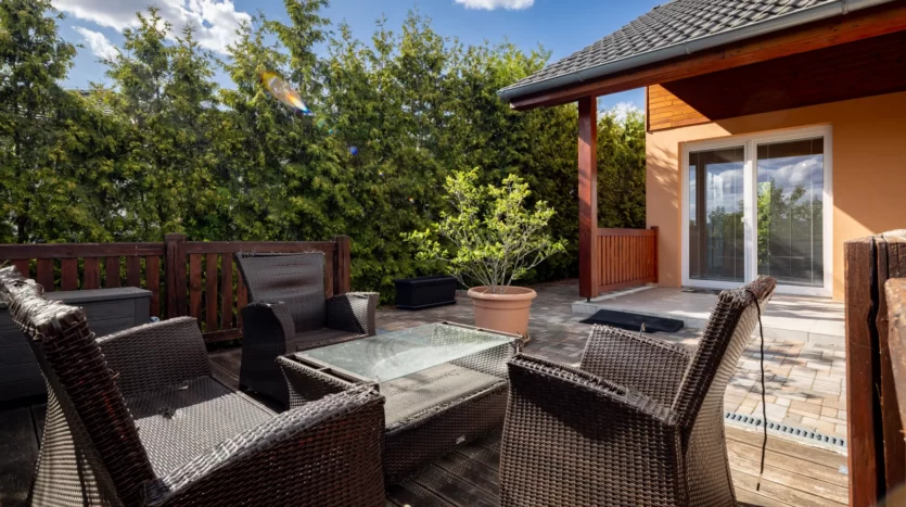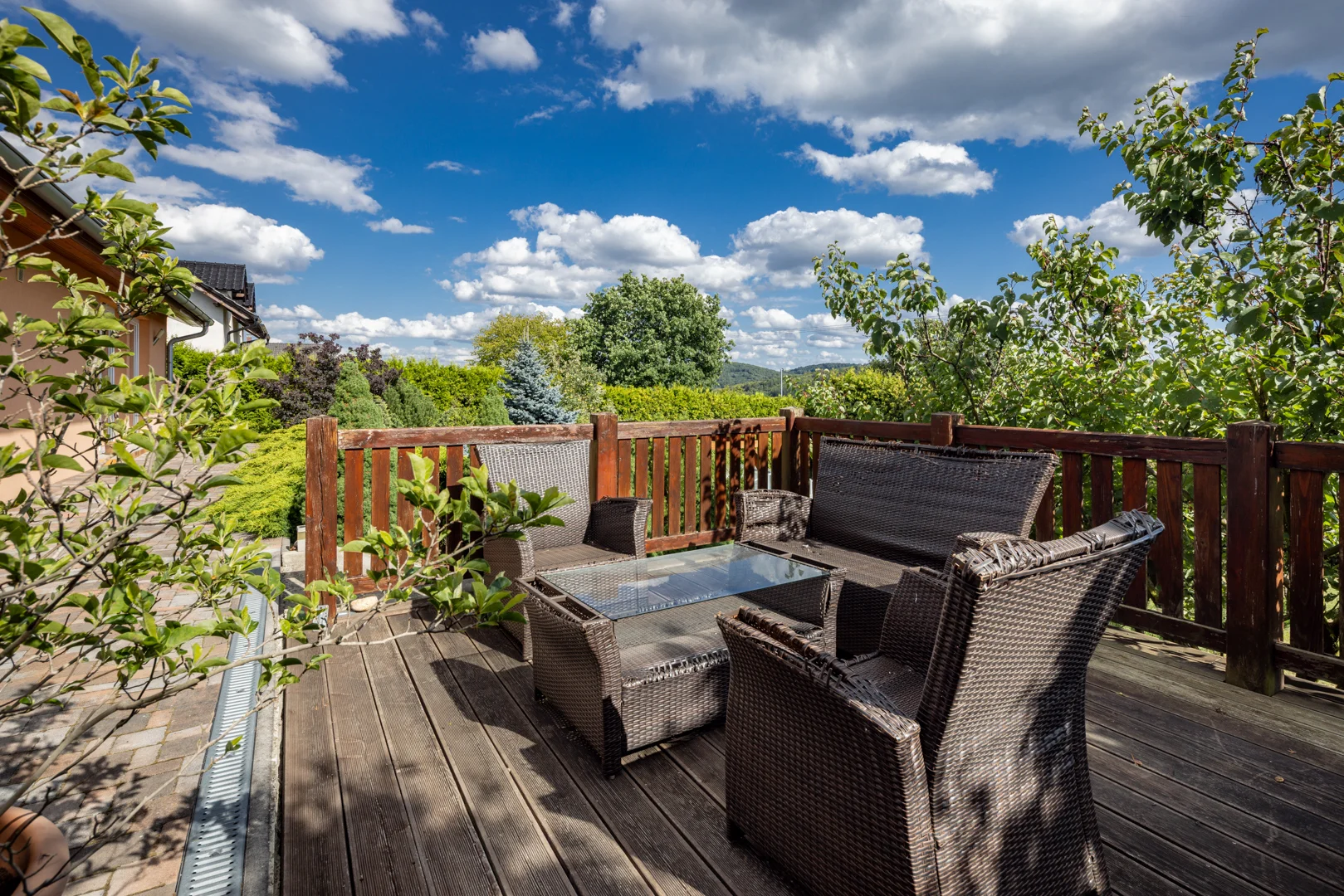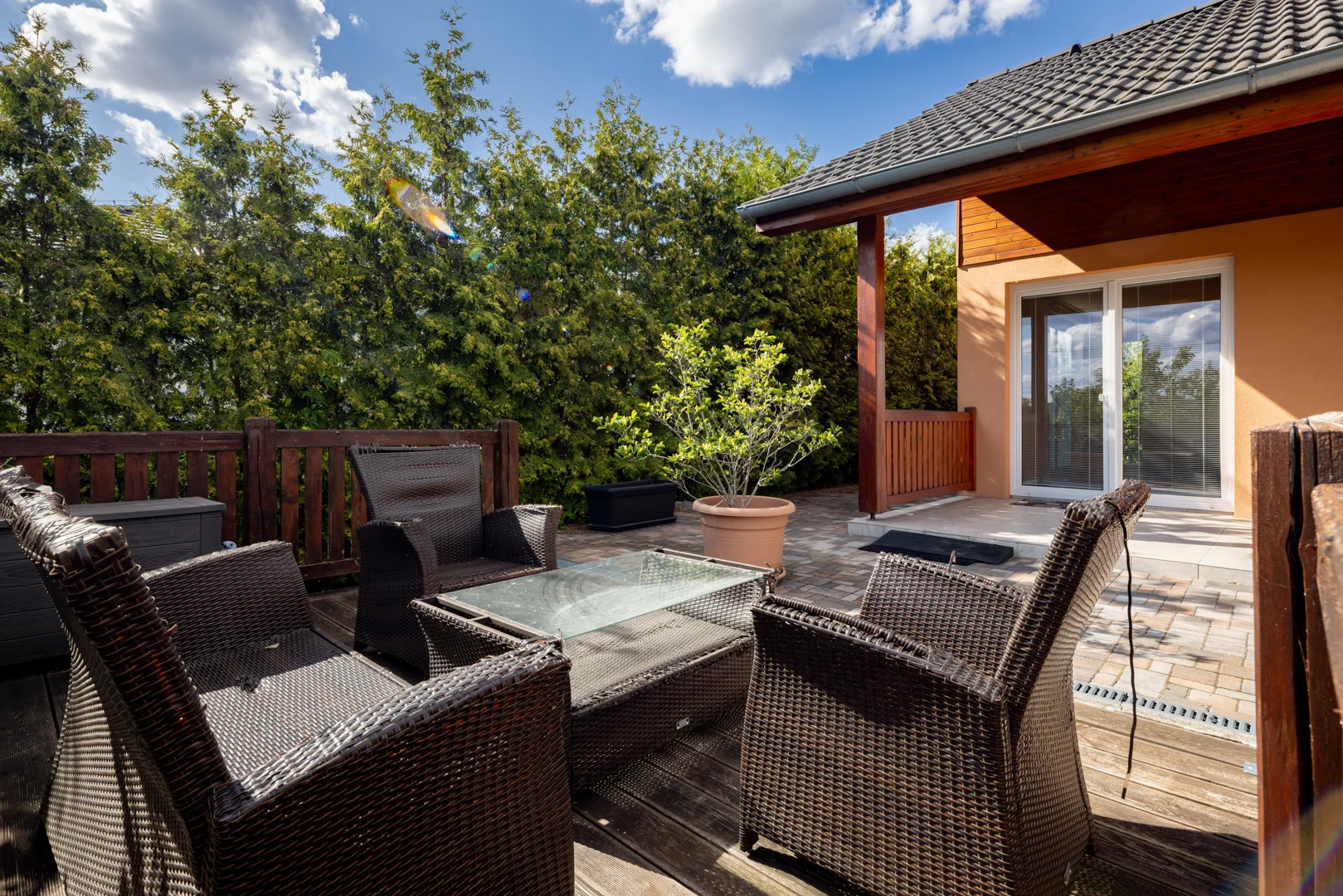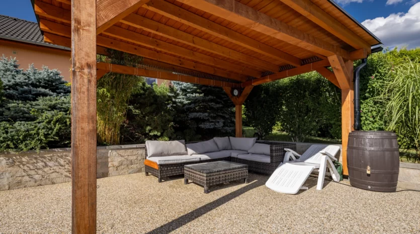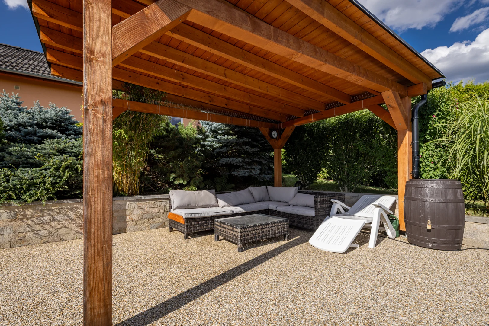 Zastřešená pergola přímo vybízí k letnímu grilování, posezení s rodinou nebo klidné ranní kávě.