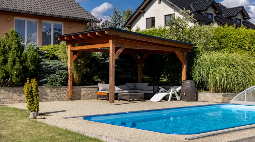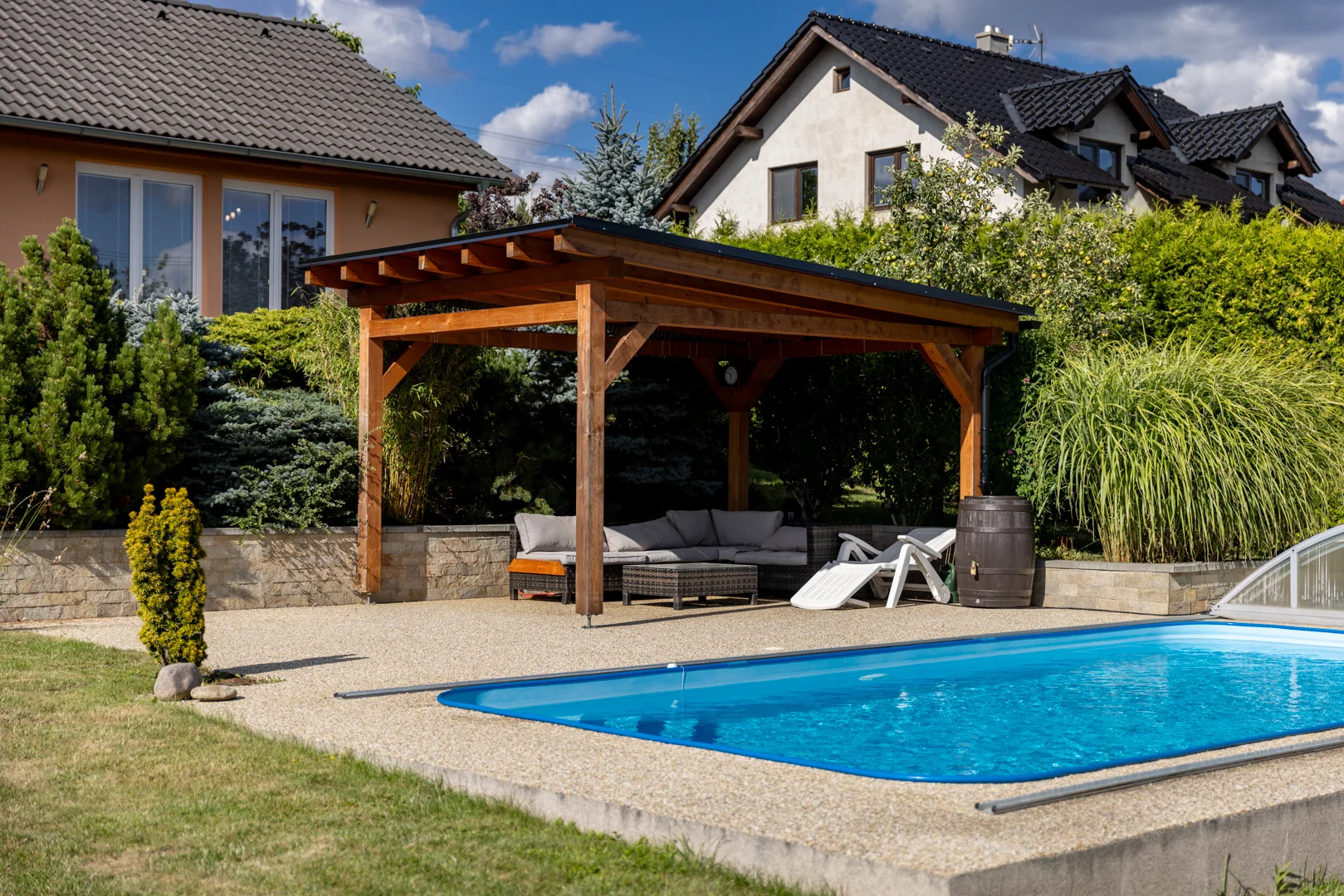 Zastřešený bazén potěší nejen v létě, ale díky zakrytí prodlužuje sezónu koupání.
