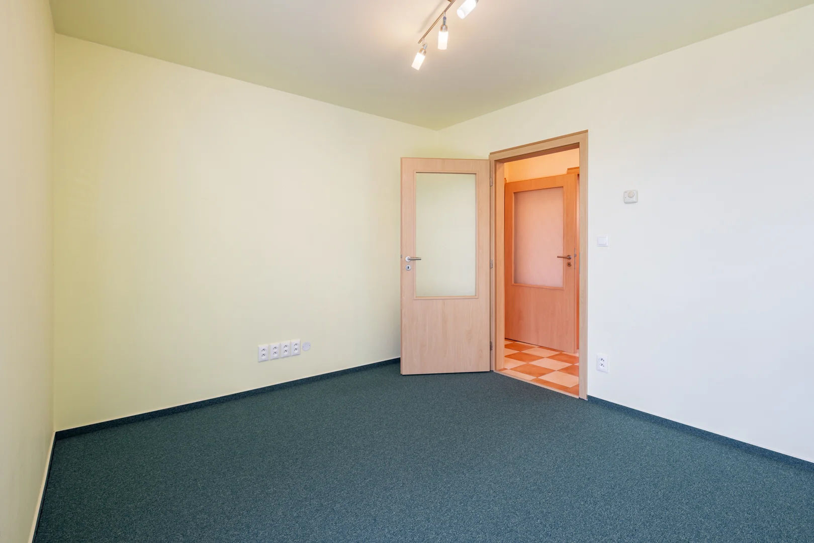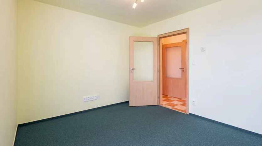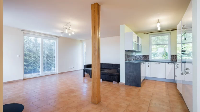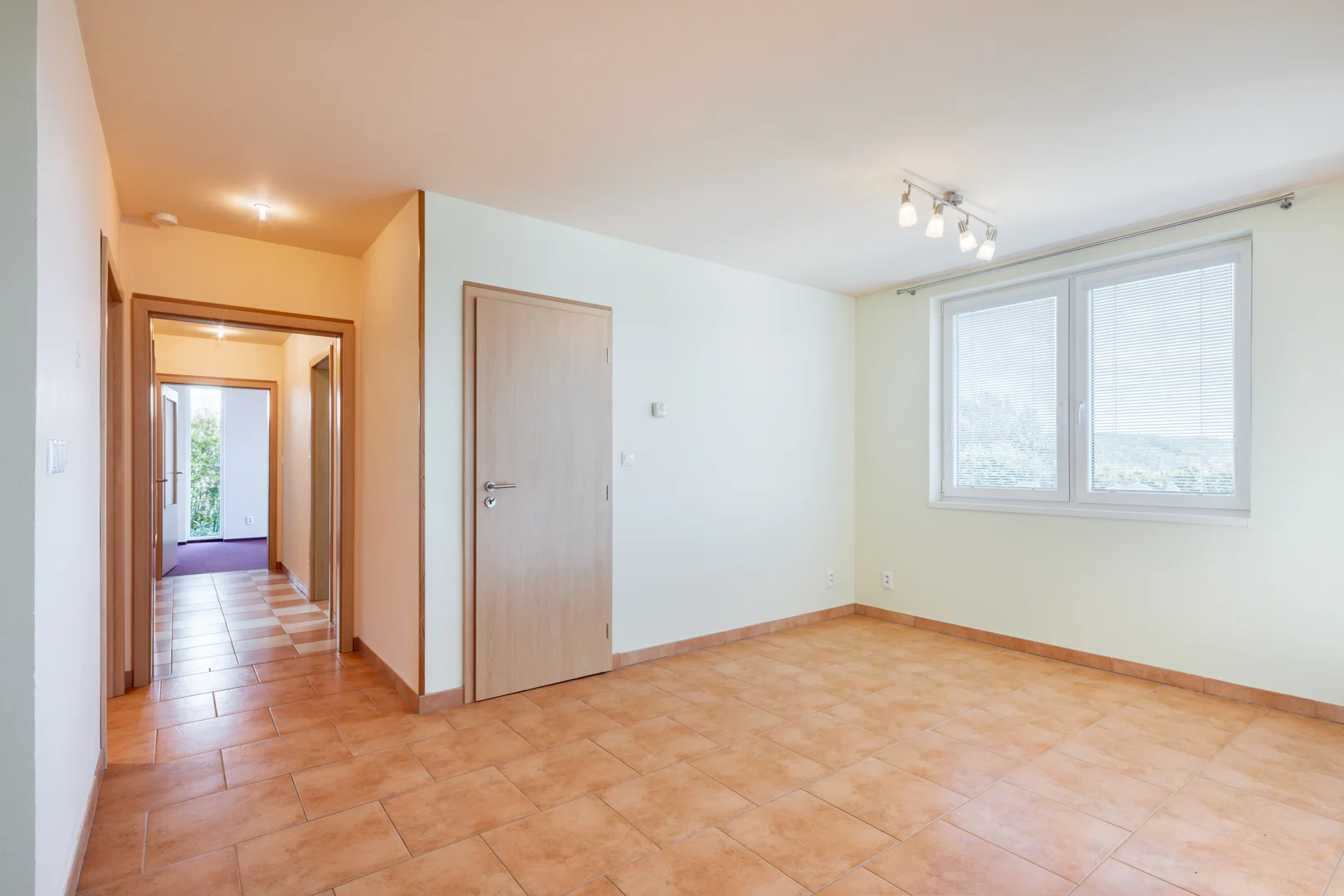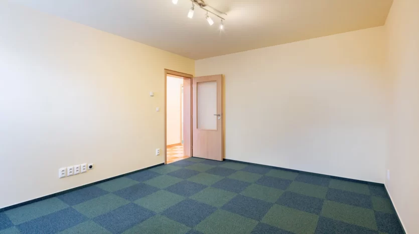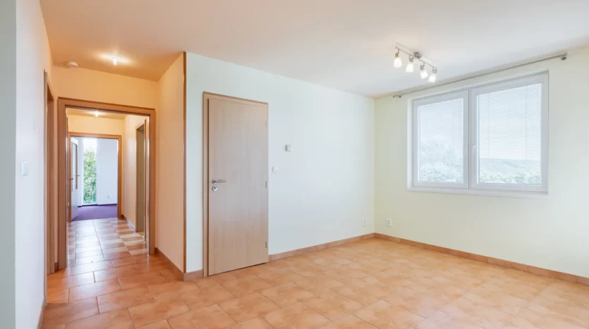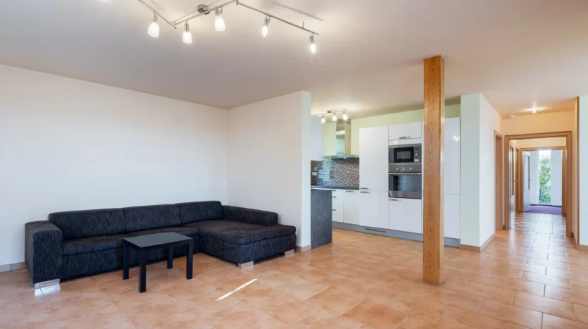 Dispozice 4+kk nabízí ideální řešení pro rodinné bydlení – prostorný obývací pokoj s kuchyňským koutem, tři samostatné pokoje, koupelna s vanou i sprchovým koutem a dostatek úložného prostoru.